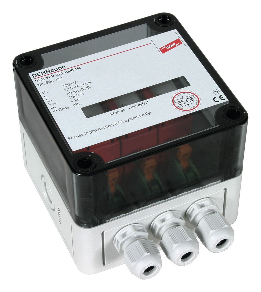 Mehrpoliger Überspannungs-Ableiter DEHNcube YPV SCI 1000 1M in Schutzart IP65. Typ 2 nach EN 50539-11 zum Schutz von 1 MPP-Eingang. Dreistufige DC-Schaltvorrichtung mit kombinierter Abtrenn- und Kurzschließvorrichtung mit sicherer elektrischer Trennung. Zum Schutz von Niederspannungs-Verbraucheranlagen vor Überspannungen. Zum Einsatz gemäß DIN IEC 60364-7-712:2011-04 (Errichten von Photovoltaik-Versorgungssystemen).
