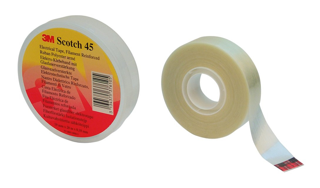 Das Scotch Glasfaserverstärkte Polyesterband 45 verbindet die guten elektrischen Eigenschaften einer Polyesterfolie mit der hohen Stabilität eines Glasgewebebandes. So hält das 0,177 Millimeter dicke Isolierband eine Durchschlagsspannung von 5.500 Volt aus und gehört mit einer Temperaturbeständigkeit bis 105 °C der Isolierstoffklasse A an. Gleichzeitig ist das bedruckbare Polyesterband beschichtet mit einem flammwidrigen, äußerst starken wärmehärtenden Silikonklebstoff und verfügt über daher eine sehr hohe Zugfestigkeit. Somit eignet es sich für alle Arten von Bündelungen, Befestigungen und Aufhängungen mit hoher mechanischer Last. Aufgrund seiner extremen Reißfestigkeit eignet sich das Klebeband auch für die kurzschlussstromfeste Bündelung von Mittelspannungskabeln. Da das transparente Polyesterband nicht UV-beständig ist, ist für Anwendungen im Außenbereich eine Abdeckung mit PVC-Isolierband erforderlich.
