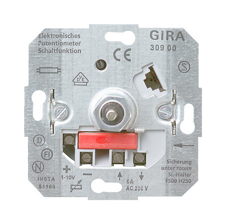Einsatz Elektronisches Potentiometer für Steuereingang 1-10 V Schaltfunktion Merkmale: - Elektronisches Potentiometer mit Schaltfunktion für elektronische Vorschalt-Geräte oder Tronic-Trafos mit 1 - 10 V-Steuereingang. - Drücken des Bedienknopfs schaltet die EVG ein und aus. - Drehen stellt die Helligkeit ein.| Manufacturer / Brand | GIRA |
