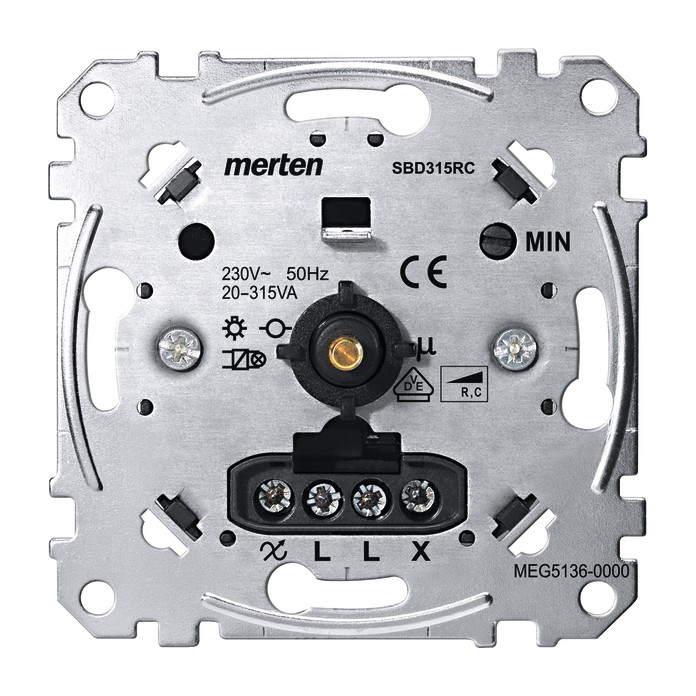 Für elektronische Trafos und Glühlampen (ohmsche Last). (Phasenabschnitt).Mit Druck-Wechselschalter. Brummfrei, kurzschlussfest, mit Überlastschutz, lampenschonender Softstart. Zu komplettieren mit: Zentralplatte mit Drehknopf System M MEG5250-03xx/-04xx/-06xx Zentralplatte mit transparenter Abdeckung und Drehknopf M-Creativ MEG5250-3500. Zentralplatte mit Drehknopf System Design MEG5250-60xx, System Fläche MEG5250-40xx/-41xx/-42xx Hinweis: Passend für Merten MET-Transformatoren. Ausführung: 20-315 W.| Manufacturer / Brand | MERTEN |