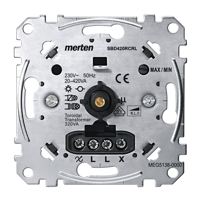 Für ohmsche, induktive sowie kapazitive Lasten, z. B. Glühlampen, dimmbare gewickelte Trafos oder elektronische Trafos. (Phasenanschnitt oder Phasenabschnitt). Der Universaldimmer erkennt automatisch die angeschlossene Last. Keine Mischlasten anschließen. Mit Druck-Wechselschalter. Zu komplettieren mit: Zentralplatte mit Drehknopf System M MEG5250-03xx/-04xx/-06xx Zentralplatte mit transparenter Abdeckung und Drehknopf M-Creativ MEG5250-3500. Zentralplatte mit Drehknopf System Design MEG5250-60xx, System Fläche MEG5250-40xx/-41xx/-42xx Hinweis: Informationen zum Thema Dimmen von LED Leuchtmittelnerhalten Sie im Internet unter Merten Dimmertest. http://www.merten.de/Dimmer-Test.dimmertest.0.html. Ausführung: 20-420 W/VA.| Manufacturer / Brand | MERTEN |