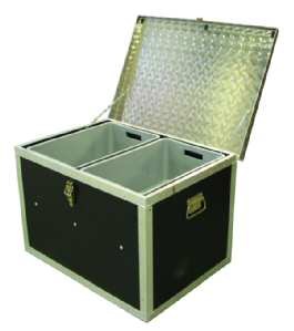 Stabiler verwindungssteifer Alu-Rahmen Wände aus hochfesten Siebdruckplatten Boden aus hochfesten, wasserdichten OSB-Platten Deckel aus Alu-Riffelblech Abschließbare Spann - Verriegelung 4 Ringösen für Stapler / Krantransport 2 klappbare Tragegriffe Links und rechts verlaufender Rahmen zur Aufnahme von Schubkästen