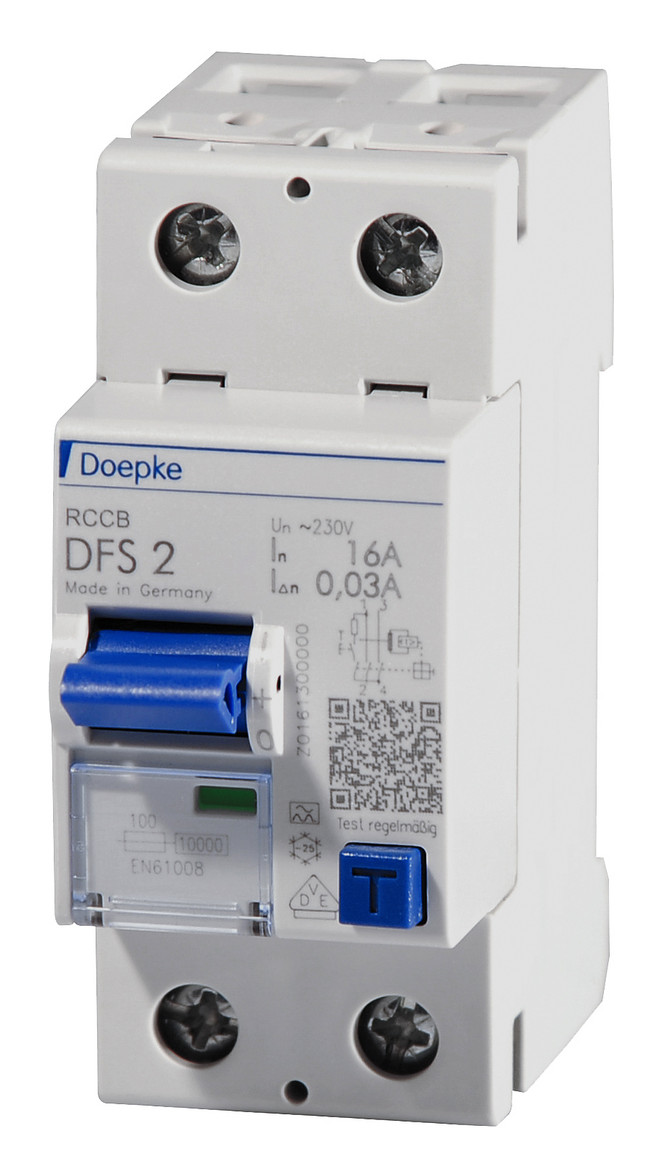 Fehlerstromschutzschalter (RCCB) schalten die Stromversorgung ab, wenn gefährlich hohe Fehlerströme auftreten. Sie schützen so Personen, Tiere und Anlagen. DFS 2 sind zweipolige Fehlerstromschutzschalter für einphasige Netze. In Standardausführung sind die kompakten Geräte zwei Teilungseinheiten schmal. Sie sind mit vielen verschiedenen Fehlerstromtypen und Ausführungen bei Bemessungsströmen bis zu 125 A erhältlich. Die großen Doppelstockklemmen können auch große Leiterquerschnitte aufnehmen. Die Ausgelöststellung des Multifunktionsschaltknebel erleichtert die Fehlersuche. Die kostenlose Etikettensoftware hilft bei der Beschriftung. Schalter des Typs A sind puls- und wechselstromsensitiv. Diese Funktion ist netzspannungsunabhängig. Geräte in Standardausführung sind für die Überwachung von Stromkreisen mit einer Bemessungsspannung von 230 V/400 V und einer Bemessungsfrequenz von 50 Hz ausgelegt. Eigenschaften: netz- und hilfsspannungsunabhängige Auslösung; sensitiv für Wechsel- und pulsierende Gleichfehlerströme (Typ A) geringe Baugröße für alle Bemessungsströme; hohe Kurzschlussfestigkeit; beidseitige Doppelstockklemmen für großen Leiterquerschnitt und Schienenanschluss; Schaltstellungsanzeige; Sichtfenster für Beschriftungsetiketten; Multifunktionsschaltknebel mit drei Positionen: "ein", "aus", "ausgelöst"; auch in der Ausführung "HD" erhältlich; Anschluss C1 Neutralleiterposition beliebig; Montageart: Schnellbefestigung auf Tragschiene; Einbaulage beliebig; Einspeiserichtung beliebig; Einsatzgebiete: Stromversorgungen von Wohn- und Zweckgebäuden sowie Industrieanlagen mit TN-S-, TT- und TN-C-S-Netzen. In IT-Netzen können Fehlerstromschutzschalter dieser Baureihe zur Abschaltung im Falle eines zweiten Fehlers vorgesehen werden.; Ausgeschlossen ist der Einsatz in TN-C-Netzen und zum Schutz von Anlagen. in denen elektronische Betriebsmittel glatte Gleichfehlerströme oder Fehlerströme mit Frequenzen ungleich 50 Hz verursachen können. Hier ist ein umfassender Schutz nicht gegeben. Für solche Anwendungen empfehlen wir unsere allstromsensitiven Fehlerstromschutzschalter (Typ B oder B+).; Fehlerstromschutzschalter (RCCB) schalten die Stromversorgung ab, wenn gefährlich hohe Fehlerströme auftreten. Sie schützen so Personen, Tiere und Anlagen. DFS 2 sind zweipolige Fehlerstromschutzschalter für einphasige Netze. In Standardausführung sind die kompakten Geräte zwei Teilungseinheiten schmal. Sie sind mit vielen verschiedenen Fehlerstromtypen und Ausführungen bei Bemessungsströmen bis zu 125 A erhältlich. Die großen Doppelstockklemmen können auch große Leiterquerschnitte aufnehmen. Die Ausgelöststellung des Multifunktionsschaltknebel erleichtert die Fehlersuche. Die kostenlose Etikettensoftware hilft bei der Beschriftung. Schalter des Typs A sind puls- und wechselstromsensitiv. Diese Funktion ist netzspannungsunabhängig. Geräte in Standardausführung sind für die Überwachung von Stromkreisen mit einer Bemessungsspannung von 230 V/400 V und einer Bemessungsfrequenz von 50 Hz ausgelegt. Eigenschaften: netz- und hilfsspannungsunabhängige Auslösung; sensitiv für Wechsel- und pulsierende Gleichfehlerströme (Typ A) geringe Baugröße für alle Bemessungsströme; hohe Kurzschlussfestigkeit; beidseitige Doppelstockklemmen für großen Leiterquerschnitt und Schienenanschluss; Schaltstellungsanzeige; Sichtfenster für Beschriftungsetiketten; Multifunktionsschaltknebel mit drei Positionen: "ein", "aus", "ausgelöst"; auch in der Ausführung "HD" erhältlich; Anschluss C1 Neutralleiterposition beliebig; Montageart: Schnellbefestigung auf Tragschiene; Einbaulage beliebig; Einspeiserichtung beliebig; Einsatzgebiete: Stromversorgungen von Wohn- und Zweckgebäuden sowie Industrieanlagen mit TN-S-, TT- und TN-C-S-Netzen. In IT-Netzen können Fehlerstromschutzschalter dieser Baureihe zur Abschaltung im Falle eines zweiten Fehlers vorgesehen werden.; Ausgeschlossen ist der Einsatz in TN-C-Netzen und zum Schutz von Anlagen. in denen elektronische Betriebsmittel glatte Gleichfehlerströme oder Fehlerströme mit Frequenzen ungleich 50 Hz verursachen können. Hier ist ein umfassender Schutz nicht gegeben. Für solche Anwendungen empfehlen wir unsere allstromsensitiven Fehlerstromschutzschalter (Typ B oder B+).;