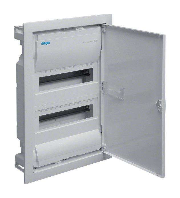 Kleinverteiler,volta,UPV,2x12PLE,IP30,m.Tür. Installationskleinverteiler Unterputz aus Kunststoff, nach DIN VDE 60670-24 und DIN 43871, geeignet zum Einsatz in Wohngebäuden nach DIN 18015. Zum Einbau von Geräten bis 63 A mit 70 mm Einbautiefe nach Maßnorm DIN 43880, Bemessungsspannung 400V/50Hz. Schutzart IP30, Schutzklasse II schutzisoliert. Bestehend aus: Kunststoff-Mauerkasten mit serienmäßigem Leitungsabfang und ausbrechbaren Leitungseinführungsschiebern mit Schnappbefestigung, integrierter Wasserwaage und verzinkten Stahlblech-Befestigungslaschen. Geräteträger aus verzinktem Stahlblech, Hutschienen einzeln isoliert einbaubar. Geräteabdeckung aus Kunststoff mit 46 mm Geräteschlitz, Schnellverschlussbefestigung mit 90° Drehung, serienmäßig plombierbar. Verdrehbarer Blendrahmen mit Tür aus Stahlblech, pulverbeschichtet und eingebrannt, mit 15 mm Putzausgleich. Tür, frontbündig mit innenliegenden handbedienbaren Scharnieren. Türverschluss mit frontbündiger Griffmulde und selbsttätig zurückklappendem Griff, Türanschlag rechts oder links ohne Blendrahmendemontage. Serienmäßige Schaltplanbefestigung in der Tür und integrierter seitlicher Leitungsführungskanal mit Kabelhalteklammern. Fingersichere PE/N-Klemme mit Stecktechnik in montagefreundlicher Schnapptechnik und N-Klemme für FI-Kreise serienmäßig.| Hersteller / Marke | HAGER |