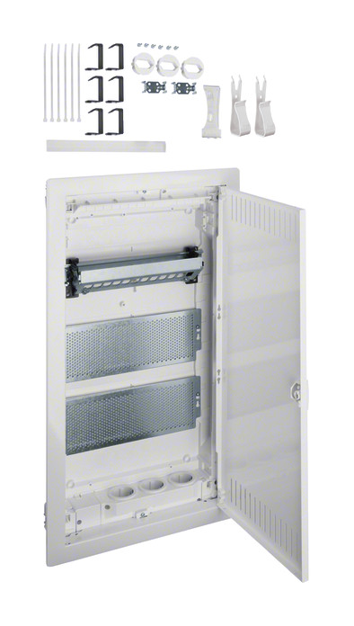 Multimedia, volta, UPV, 3-reihig, mit geschlitzter Stahlblechtür. Installationskleinverteiler Unterputz aus Kunststoff, nach DIN VDE 60670-24 und DIN 43871, geeignet zum Einsatz in Wohngebäuden nach DIN 18015 und zum Einbau von schutzisolierten VDI Komponenten. Schutzart IP30, Schutzklasse II schutzisoliert. Bestehend aus: Kunststoff-Mauerkasten mit serienmäßigem Leitungsabfang, ausbrechbarem Leitungseinführungsschieber mit Schnappbefestigung, integrierter Wasserwaage und verzinkten Stahlblech-Befestigungslaschen. Verdrehbarer Blendrahmen mit Lüftungstür aus Stahlblech, pulverbeschichtet und eingebrannt, mit 15 mm Putzausgleich. Lüftungstür, frontbündig mit innenliegenden handbedienbaren Scharnieren. Türverschluss mit frontbündiger Griffmulde und selbsttätig zurückklappendem Griff, Türanschlag rechts oder links ohne Blendrahmendemontage. Oberer Anschlussraum: Patch Panel und DIN-Hutschiene isoliert aufgerastet zur Aufnahme von unterschiedlichen Kommunikationsmodulen, für den geforderten Funktionspotentialausgleich nach DIN EN 50310 (VDE 0800-2-310) sind am Patch Panel 2 Schraubbefestigungen vorhanden. Beschriftungsmöglichkeit mit beiliegendem Bezeichnungsstreifen zur Portbeschriftung. Vormontierte gelochte Montageplatten aus verzinktem Stahlblech mit 3,2 mm Lochung sind eingebaut. Ein Universalhaltebügel kann für die schraublose Befestigung von VDI-Komponenten direkt auf dem Lochblech eingehängt werden. Im unteren Anschlussraum ist eine 3-fach Schutzkontaktsteckdose (90 Grad drehbar) montiert. Über eine Anschlussklemme sind die Steckdosen direkt anschließbar. Die Steckdosen sind mit einer beiliegenden Schutzkontaktabdeckung zur Einhaltung der Schutzklasse II bestückbar. Die 3-fach Schutzkontaktsteckdose ist zusätzlich in zwei Positionen auf einer DIN-Hutschiene montierbar. Hinweis: Ein Überspannungsschutzmodul Typ 3 kann direkt angeschlossen werden (nicht enthalten).| Hersteller / Marke | HAGER |