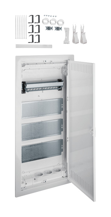 Multimedia, volta, UPV, 4-reihig, mit geschlitzter Stahlblechtür. Installationskleinverteiler Unterputz aus Kunststoff, nach DIN VDE 60670-24 und DIN 43871, geeignet zum Einsatz in Wohngebäuden nach DIN 18015 und zum Einbau von schutzisolierten VDI Komponenten. Schutzart IP30, Schutzklasse II schutzisoliert. Bestehend aus: Kunststoff-Mauerkasten mit serienmäßigem Leitungsabfang, ausbrechbarem Leitungseinführungsschieber mit Schnappbefestigung, integrierter Wasserwaage und verzinkten Stahlblech-Befestigungslaschen. Verdrehbarer Blendrahmen mit Lüftungstür aus Stahlblech, pulverbeschichtet und eingebrannt, mit 15 mm Putzausgleich. Lüftungstür, frontbündig mit innenliegenden handbedienbaren Scharnieren. Türverschluss mit frontbündiger Griffmulde und selbsttätig zurückklappendem Griff, Türanschlag rechts oder links ohne Blendrahmendemontage. Oberer Anschlussraum: Patch Panel und DIN-Hutschiene isoliert aufgerastet zur Aufnahme von unterschiedlichen Kommunikationsmodulen, für den geforderten Funktionspotentialausgleich nach DIN EN 50310 (VDE 0800-2-310) sind am Patch Panel 2 Schraubbefestigungen vorhanden. Beschriftungsmöglichkeit mit beiliegendem Bezeichnungsstreifen zur Portbeschriftung. Vormontierte gelochte Montageplatten aus verzinktem Stahlblech mit 3,2 mm Lochung sind eingebaut. Ein Universalhaltebügel kann für die schraublose Befestigung von VDI-Komponenten direkt auf dem Lochblech eingehängt werden. Im unteren Anschlussraum ist eine 3-fach Schutzkontaktsteckdose (90 Grad drehbar) montiert. Über eine Anschlussklemme sind die Steckdosen direkt anschließbar. Die Steckdosen sind mit einer beiliegenden Schutzkontaktabdeckung zur Einhaltung der Schutzklasse II bestückbar. Die 3-fach Schutzkontaktsteckdose ist zusätzlich in zwei Positionen auf einer DIN-Hutschiene montierbar. Hinweis: Ein Überspannungsschutzmodul Typ 3 kann direkt angeschlossen werden (nicht enthalten).| Hersteller / Marke | HAGER |