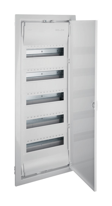 Kleinverteiler,volta,UPV,5x12PLE,IP30,m.Tür. Installationskleinverteiler Unterputz aus Kunststoff, nach DIN VDE 60670-24 und DIN 43871, geeignet zum Einsatz in Wohngebäuden nach DIN 18015. Zum Einbau von Geräten bis 63 A mit 70 mm Einbautiefe nach Maßnorm DIN 43880, Bemessungsspannung 400V/50Hz. Schutzart IP30, Schutzklasse II schutzisoliert. Bestehend aus: Kunststoff-Mauerkasten mit serienmäßigem Leitungsabfang und ausbrechbaren Leitungseinführungsschiebern mit Schnappbefestigung, integrierter Wasserwaage und verzinkten Stahlblech-Befestigungslaschen. Geräteträger aus verzinktem Stahlblech, Hutschienen einzeln isoliert einbaubar. Geräteabdeckung aus Kunststoff mit 46 mm Geräteschlitz, Schnellverschlussbefestigung mit 90° Drehung, serienmäßig plombierbar. Verdrehbarer Blendrahmen mit Tür aus Stahlblech, pulverbeschichtet und eingebrannt, mit 15 mm Putzausgleich. Tür, frontbündig mit innenliegenden handbedienbaren Scharnieren. Türverschluss mit frontbündiger Griffmulde und selbsttätig zurückklappendem Griff, Türanschlag rechts oder links ohne Blendrahmendemontage. Serienmäßige Schaltplanbefestigung in der Tür und integrierter seitlicher Leitungsführungskanal mit Kabelhalteklammern. Fingersichere PE/N-Klemme mit Stecktechnik in montagefreundlicher Schnapptechnik und N-Klemme für FI-Kreise serienmäßig.| Hersteller / Marke | HAGER |