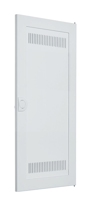 Tür, volta, Kunststoff, geschlitzt für UP- und Hohlwandverteiler, 3-reihig, IP30. Volta Tür mit außen verlaufendem Stahlblech pulverbeschichtet und eingebrannt mit zentrierten weißen undurchsichtigem dem Rahmen angepassten Kunststoff geschlitzt. Die Tür ist frontbündig einbaubar mit innenliegenden handbedienbaren Scharnieren. Der Türverschluss hat eine frontbündige Griffmulde mit selbsttätig zurückklappendem Griff. Ohne zusätzliche Demontage des Blendrahmens kann der Türanschlag rechts oder links gewählt werden. Die Schlitze in der Tür sind zur besseren Wärmeableitung der eingebauten W-LAN Komponenten.