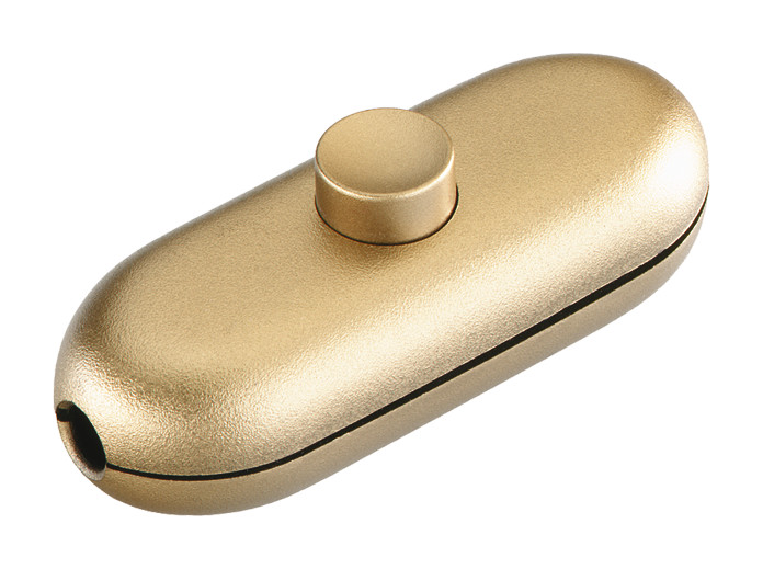 Schnur-Zwischenschalter Serie 5044, 1polig, Gehäuse: gold / Knopf: gold 2(1)A 250 V Ausschalter, 1polig Gehäuse und Zugentlastung geschraubt, 2 Verbindungsklemmen für 2- und 3-adrige Kabel.| Hersteller / Marke | BACHMANN |
