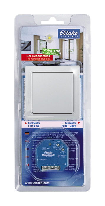 Blisterpack Schalten mit Funktaster F2T65 und Funkaktor Stromstoß-Schaltrelais FSR61-230V. Smart Home Sensor und Smart Home Aktor. F2T65: Funktaster reinweiß glänzend für Einzel-Montage 84x84x16mm oder Montage in das E-Design65-Schaltersystem. Erzeugt die Energie für Funktelegramme selbst bei Tastendruck, daher ohne Anschlussleitung und kein Stand-by-Verlust. Funktaster mit einer Wippe können zwei auswertbare Signale senden: Wippe oben drücken und Wippe unten drücken. Die Halteplatte kann auf eine ebene Fläche geschraubt oder mit der beiliegenden Klebefolie an die Wand, auf Glas oder auf Möbel geklebt werden. Über einer 55mm-Schalterdose werden die in der Dose vorhandenen Hülsen zur Schraubbefestigung verwendet. FSR61-230V: Funktaktor Stromstoß-Schaltrelais 1 Schließer potenzialfrei 10A/250V AC, Glühlampen 2000 Watt, Rückfallverzögerung mit Ausschaltvorwarnung und Taster-Dauerlicht zuschaltbar. Verschlüsselter Funk, bidirektionaler Funk und Repeater-Funktion zuschaltbar. Stand-by-Verlust nur 0,8 Watt. Für Einbaumontage. 45mm lang, 45mm breit, 33mm tief. Versorgungs- und Steuerspannung örtlich 230V. Beim Ausfall der Versorgungsspannung bleibt der Schaltzustand erhalten. Bei wiederkehrender Versorgungsspannung wird definiert ausgeschaltet. Nach der Installation die automatische kurze Synchronisation abwarten, bevor der geschaltete Verbraucher an das Netz gelegt wird. Zusätzlich zum Funk-Steuereingang über eine innenliegende Antenne kann dieser Funkaktor auch mit einem eventuell davor montierten konventionellen Steuertaster örtlich gesteuert werden. Ein Glimmlampenstrom ist nicht zugelassen.| Hersteller / Marke | ELTAKO |
