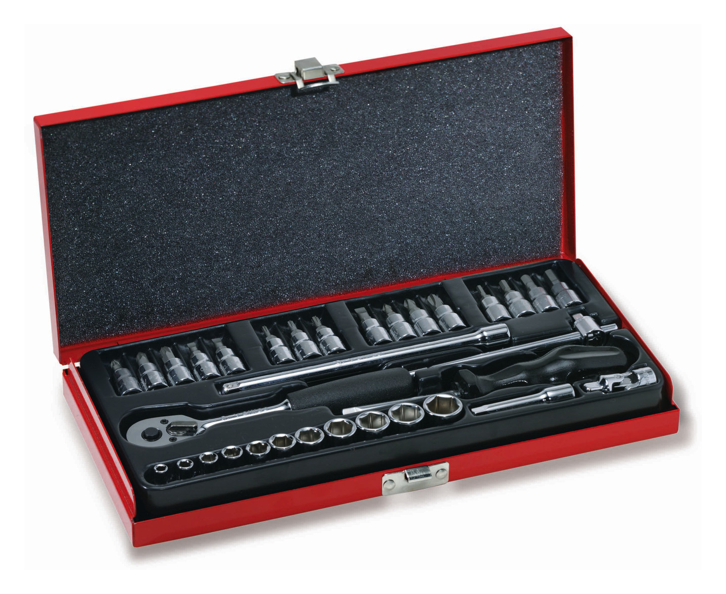 Steckschlüssel-Satz - 33-teilig, 1/4Zoll 4-kt. -Antrieb, Sechskant-Einsätze aus Chrom-Vanadium-Stahl, poliertverchromt, in Metallkassette, Umschaltknarre mit PosiLock Festhaltemechanismus, Gleitgriff, Verlängerungen 50 mm und 150 mm, Halter, Kardangelenk, Einsätze: Sechskant-Steckschlüssel SW 4 bis 14 mm, Innensechskant (Innensechskant) 3 bis 6 mm, Schlitz-Schraubendreher 0, 5 x 4 - 0, 6 x 4, 5 - 0, 8 x 5, 5, Kreuzschlitz-Schraubendreher PH 1 - PH 2 -PH 3 - PZ 1 - PZ 2 - PZ 3, Torx -Schraubendreher T 10 - T 15 - T 20| Hersteller / Marke | CIMCO |