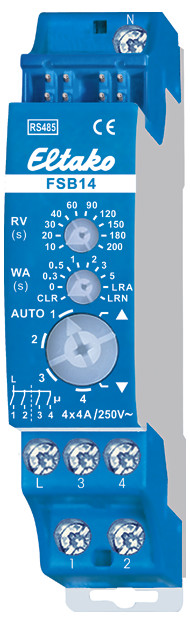 Schaltaktor Beschattungselemente und Rollladen mit 2 Kanälen für zwei 230V-Motoren. 2+2 Schließer 4A/250V AC, potenzialgetrennt von der Versorgungsspannung 12V. Bidirektional. Stand-by-Verlust nur 0,1 Watt. Reiheneinbaugerät für Montage auf Tragschiene. Anschluss an den Eltako-RS485-Bus. Querverdrahtung Bus und Stromversorgung mit Steckbrücke. Kontaktschaltung im Nulldurchgang zur Schonung der Kontakte und Motoren. Ein Motor wird an 1, 2 und N angeschlossen, ein zweiter Motor gegebenenfalls an 3, 4 und N. Sind beide Relais des FSB14 eingeschaltet, werden 0,4 Watt benötigt. Beim Ausfall der Versorgungsspannung wird definiert ausgeschaltet. Die Taster können entweder als Richtungstaster oder als Universaltaster eingelernt werden: Örtliche Steuerung mit Universaltaster: Mit jedem Impuls wechselt die Schaltstellung in der Reihenfolge Auf, Halt, Ab, Halt. Örtliche Steuerung mit Richtungstaster: Mit einem Tastimpuls oben wird die Schaltstellung Auf gezielt aktiviert. Mit einem Tastimpuls unten wird die Schaltstellung Ab gezielt aktiviert. Ein weiterer Tastimpuls in dieselbe Richtung unterbricht den Ablauf sofort. Bei einem Tastimpuls in die andere Richtung wird jedoch gestoppt und nach einer Pause von 500ms in die entgegengesetzte Fahrtrichtung umgeschaltet. Zentralsteuerung dynamisch ohne Priorität: Mit einem Steuersignal eines als Zentralsteuerungstaster ohne Priorität eingelernten Tasters wird gezielt die Schaltstellung Auf oben oder Ab unten aktiviert. Ohne Priorität deswegen, weil diese Funktion von anderen Steuersignalen übersteuert werden kann. Zentralsteuerung dynamisch mit Priorität: Mit einem Steuersignal von mindestens 2 Sekunden eines als Zentralsteuerungstaster mit Priorität eingelernten Tasters wird gezielt die Schaltstellung Auf oben und Ab unten aktiviert. Mit Priorität deswegen, weil diese Steuersignale nicht von anderen Steuersignalen übersteuert werden können, solange bis der Zentralbefehl durch einen Tastimpuls Auf oder Ab von dem Zentralsteuertaster wieder aufgehoben wird. Mit einem Steuersignal, z.B. eines als Zentralsteuerungstaster mit Priorität eingelernten FSM61, wird gezielt die Schaltstellung Auf oder Ab und die Priorität aktiviert. Mit Priorität deswegen, weil diese Steuersignale nicht von anderen Steuersignalen übersteuert werden können, solange bis der Zentralbefehl durch das Ende des Steuersignals wieder aufgehoben wird. Beschattungsszenen-Steuerung: Mit einem Steuersignal eines als Szenentaster eingelernten Tasters mit Doppelwippe oder automatisch durch einen zusätzlich eingelernten Funk-Außen-Helligkeitssensor, können bis zu 4 zuvor hinterlegte Ab-Laufzeiten abgerufen werden. Bei Steuerung über die GFVS-Software können Fahrbefehle für Auf und Ab mit der exakten Fahrzeitangabe gestartet werden. Da der Aktor nach jeder Aktivität, auch bei durch Taster ausgelöstes Fahren, exakt die gefahrene Zeit zurückmeldet, wird die Position der Beschattung in der GFVS-Software immer korrekt angezeigt. Bei Erreichen der Endlagen oben und unten wird die Position automatisch synchronisiert. Die LED unter dem oberen Drehschalter begleitet den Einlernvorgang gemäß Bedienungsanleitung und zeigt im Betrieb Steuerbefehle durch kurzes Aufblinken an.