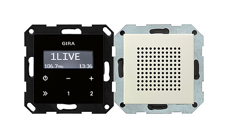 Unterputz-Radio RDS mit einem Lautsprecher Bedienaufsatz in Schwarzglasoptik Cremeweiß glänzend Merkmale: - UKW-Radio mit RDS-Anzeige zur Unterputz-Montage. - Das Unterputz-Radio RDS besteht aus einem Einsatz Radio mit Bedienaufsatz und einem Einsatz Lautsprecher mit Abdeckung. - Der Einsatz Radio ist kompakt in einem Unterputz-Einsatz untergebracht und kann somit in eine einzelne Gerätedose installiert werden. - Der Lautsprecher kann mit dem Einsatz Radio in einer Kombination oder auch abgesetzt in eine Gerätedose installiert werden. An den Einsatz Radio können zwei Lautsprecher angeschlossen werden. - Das Radio erkennt angeschlossene Lautsprecher automatisch und schaltet zwischen Stereo- und Monobetrieb um. - Das Display des Bedienaufsatzes zeigt bei einem entsprechenden RDS-Signal den Sendernamen, die Sendefrequenz und die Uhrzeit an. - Die Bedienung des Radios erfolgt über die kapazitiven Tasten des Bedienaufsatzes. Zur Bedienung ist lediglich eine leichte Berührung der Symbole notwendig. - Das Unterputz-Radio RDS verfügt über zwei Speicherplätze, auf denen je ein Sender einfach per Tastenbetätigung gespeichert und abgerufen werden kann. - Über den Nebenstelleneingang kann das Radio z. B. mit einem Lichtschalter oder einem Automatikschalter zusammen mit der Raumbeleuchtung eingeschaltet werden. - Über den Stereo-AUX-Eingang des Radios können externe Audioquellen, z. B. MP3-Player, in das Radio eingespeist werden. Zum Anschluss der externen Audioquelle wird zusätzlich ein Einsatz Cinch-Audio benötigt, welcher an die AUX-Klemmen des Einsatzes Radio angeschlossen wird. - Der Einsatz Dockingstation wird zur Musikwiedergabe direkt an den Stereo-AUX-Eingang angeschlossen. - Im Sleep-Modus schaltet das Radio 30 Minuten nach dem Einschalten automatisch wieder aus. Hinweise : - In Kombination mit weiteren elektronischen Geräten unter einer gemeinsamen Abdeckung kann es zu Empfangsbeeinträchtigungen kommen.| Hersteller / Marke | GIRA |