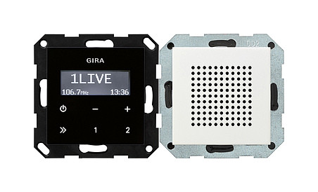 Unterputz-Radio RDS mit einem Lautsprecher Bedienaufsatz in Schwarzglasoptik Reinweiß seidenmatt Merkmale: - UKW-Radio mit RDS-Anzeige zur Unterputz-Montage. - Das Unterputz-Radio RDS besteht aus einem Einsatz Radio mit Bedienaufsatz und einem Einsatz Lautsprecher mit Abdeckung. - Der Einsatz Radio ist kompakt in einem Unterputz-Einsatz untergebracht und kann somit in eine einzelne Gerätedose installiert werden. - Der Lautsprecher kann mit dem Einsatz Radio in einer Kombination oder auch abgesetzt in eine Gerätedose installiert werden. An den Einsatz Radio können zwei Lautsprecher angeschlossen werden. - Das Radio erkennt angeschlossene Lautsprecher automatisch und schaltet zwischen Stereo- und Monobetrieb um. - Das Display des Bedienaufsatzes zeigt bei einem entsprechenden RDS-Signal den Sendernamen, die Sendefrequenz und die Uhrzeit an. - Die Bedienung des Radios erfolgt über die kapazitiven Tasten des Bedienaufsatzes. Zur Bedienung ist lediglich eine leichte Berührung der Symbole notwendig. - Das Unterputz-Radio RDS verfügt über zwei Speicherplätze, auf denen je ein Sender einfach per Tastenbetätigung gespeichert und abgerufen werden kann. - Über den Nebenstelleneingang kann das Radio z. B. mit einem Lichtschalter oder einem Automatikschalter zusammen mit der Raumbeleuchtung eingeschaltet werden. - Über den Stereo-AUX-Eingang des Radios können externe Audioquellen, z. B. MP3-Player, in das Radio eingespeist werden. Zum Anschluss der externen Audioquelle wird zusätzlich ein Einsatz Cinch-Audio benötigt, welcher an die AUX-Klemmen des Einsatzes Radio angeschlossen wird. - Der Einsatz Dockingstation wird zur Musikwiedergabe direkt an den Stereo-AUX-Eingang angeschlossen. - Im Sleep-Modus schaltet das Radio 30 Minuten nach dem Einschalten automatisch wieder aus. Hinweise : - In Kombination mit weiteren elektronischen Geräten unter einer gemeinsamen Abdeckung kann es zu Empfangsbeeinträchtigungen kommen.| Hersteller / Marke | GIRA |