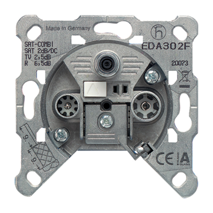 Antennendose, Universal-Sat/BK, 3-Loch, Sat-ZF-Dose mit rückkanaltauglichen, breitbandigen BK-/CATV-Auslässen (Verteiler-Filter-Kombination), Frequenzbereich: IN - TV (IEC-Stecker): 5 bis 862 MHz, IN - RF (IEC-Buchse): 5 bis 118 MHz und IN- SAT (F-Buchse) 950 bis 2400 MHz, Dämpfung: IN - TV (IEC-Stecker): 2,5 dB, IN - RF (IEC-Buchse): 6,5 dB und IN - SAT (F-Buchse): 2,2 dB, Entkopplung: TV - SAT: VHF, UHF / SAT: 20 / 20 dB, RF - SAT: VHF / SAT: 35 / 30 dB und TV - RF: VHF, UHF: 20 dB, Gleichstrompfad SAT - IN (F-Buchse): 13/18 V, 22 kHz, maximal. + 24 V / 0,5 A, verwindungssteifer, passivierter Zink-Druckguss-Dosenkörper, Federklemmen, Anschlussoptionen an BK-Kabel-Netz oder terrestrische Antennenanlagen (Allround-Dose), Einzeldose, Abschluss der vom Abzweiger (Multi-Tap), Multischalter oder Sat-LNB kommenden, entkoppelten Stichleitungen (Sternstruktur)| Hersteller / Marke | JUNG |