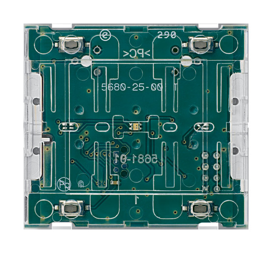 Für System Design. Taster-Modul ohne Wippe. Das Taster-Modul wird auf den gewünschten Einsatz mit Modul-Schnittstelle aufgesteckt und mit der Wippe für Taster-Modul 1fach des passenden Designs komplettiert. Fernbedienbar und programmierbar über die Wiser Room App. Sie können über die App Einstellungen vornehmen und zusätzliche Funktionen nutzen, wie z. B. Timer (Treppenlicht). Zeitschaltuhr. Zufallsfunktion. Impulsgeber. Memoryfunktion. Minimale/maximale Helligkeit. Magnetkontakt. Sonnenschutzfunktion. Orientierungslicht. Funktionen Lokal schalten, Zeitschaltuhr, Zufallsfunktion, Timer mit/ohne Vorwarnung, Impulsgeber -Elektronik-Schalt-Einsatz. Relais-Schalt-Einsatz. Elektronik-Schalt-Einsatz, 2fach (beide Kanäle gleichzeitig). Relais-Schalt-Einsatz, 2fach (beide Kanäle gleichzeitig). Lokal schalten/ dimmen, Zeitschaltuhr, Zufallsfunktion, Timer mit/ohne Vorwarnung -Universal-Dimmer-Einsatz. Universal-Dimmer-Einsatz, 2fach (beide Kanäle gleichzeitig). Steuerungs-Einsatz 1-10 V. DALI-Steuerungs-Einsatz. Lokal Jalousien/ Rollladen steuern, Zeitschaltuhr, Zufallsfunktion, Sonnenschutz-Funktion -Jalousiesteuerungs-Einsatz. Global schalten, dimmen, Jalousie/Rollladen steuern, Zeitschaltuhr, Zufallsfunktion -Zentralstellen-Einsatz. Bedienelemente 2 Tasten. Anzeigeelemente 1 Status-LED, 1 Orientierungs-LED. Anschluss Modul-Schnittstelle. Zu komplettieren mit Zentralstellen-Einsatz MEG5190-0000. Elektronik-Schalt-Einsatz MEG5151-0000. Elektronik-Schalt-Einsatz, 2fach MEG5152-0000. Relais-Schalt-Einsatz MEG5161-0000. Relais-Schalt-Einsatz, 2fach MEG5162-0000. Jalousiesteuerungs-Einsatz MEG5165-0000. Universal-Dimmer-Einsatz MEG5171-0000. Universal-Dimmer-Einsatz, 2fach MEG5172-0000. Steuerungs-Einsatz 1-10 V MEG5180-0000. DALI-Steuerungs-Einsatz MEG5185-0000. Zu komplettieren mit Wippe für Taster-Modul 1fach System Design MEG5210-60xx Wippe für Taster-Modul 1fach (1/0) System Design MEG5211-60xx Wippe für Taster-Modul 1fach (Pfeile Auf/Ab) System Design MEG5215-60xx. Hinweis Steuerbar über Bluetooth (Verfügbar bei Geräten mit Bluetooth Smart Ready ab V4.1). Die APP Wiser Roomist lauffähig auf Geräten ab AndroidTM 4.4 und Apple iOS9.1.