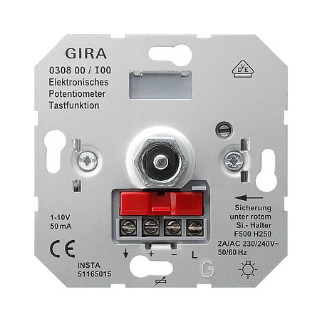 Einsatz Elektronisches Potentiometer für Steuereingang 1-10 V Tasterfunktion Merkmale: - Elektronisches Potentiometer mit Tasterfunktion (nur in Verbindung mit Stromstoßschalter) für elektronische Vorschaltgeräte oder Tronic-Trafos mit Steuereingang 1-10 V. - Drücken des Bedienknopfs gibt einen Impuls auf den Stromstoßschalter und schaltet die EVG ein und aus. - Drehen stellt die Helligkeit ein.| Hersteller / Marke | GIRA |