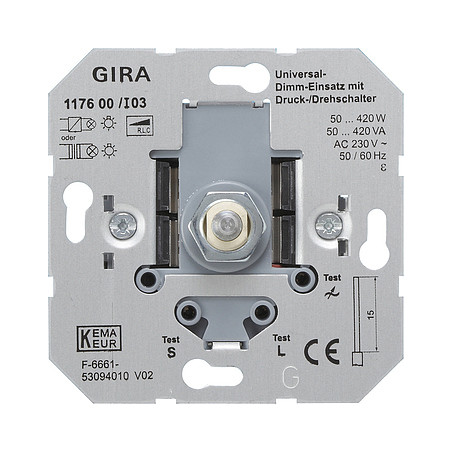 Universal-Dimmeinsatz mit Druck- und Drehschalter 2 50 - 420 W VA Merkmale: - Universaldimmer zum Schalten und Dimmen verschiedener Lichtquellen wie Glühlampen, HV-Halogen, NV-Halogen mit Gira Tronic-Trafos und NV-Halogen mit konventionellen Trafos. - Lampenschonendes Einschalten. - Elektronischer Kurzschlussschutz. - Nebenstellenbetrieb ist mit einem Nebenstelleneinsatz möglich. - Automatischer Übertemperaturschutz. - Leistungserweiterung durch Leistungszusätze. - Mit Federsteckklemme. Hinweise : - Kapazitive Lasten (z. B. Gira Tronic-Trafos) und induktive Lasten (z. B. konventionelle Trafos) nicht gemeinsam am Universal-Dimmeinsatz anschließen. - Bei höherer Umgebungstemperatur die angeschlossene Last reduzieren.| Hersteller / Marke | GIRA |