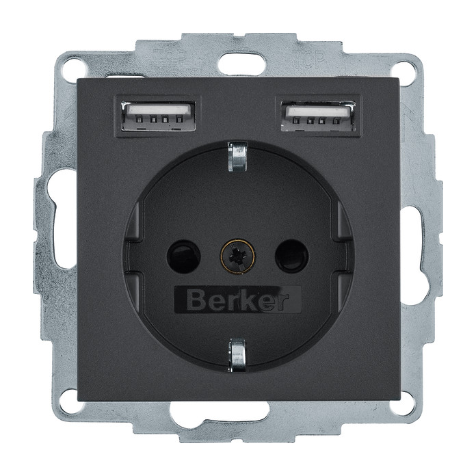 Steckdose SCHUKO/USB, B.3/B.7, anthrazit matt. Steckdose SCHUKO mit 2 USB-Buchsen Typ A zum Laden mobiler Endgeräte, wie z.B. Tablets, Smartphones, Navigationsgeräte und Digitalkameras über USB-Kabel, kurzschlussfest und überlastsicher (elektronische Sicherung), für Unterputz- und Hohlwandmontage, mit Steckklemmen.Steckdose SCHUKO mit 2 USB-Buchsen Typ A zum Laden mobiler Endgeräte, wie z.B. Tablets, Smartphones, Navigationsgeräte und Digitalkameras über USB-Kabel, kurzschlussfest und überlastsicher (elektronische Sicherung), für Unterputz- und Hohlwandmontage, mit Steckklemmen.