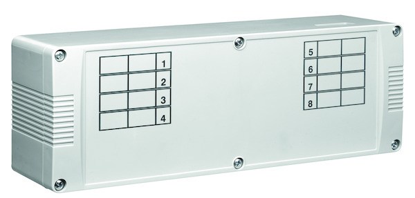 Klemmenleiste für Heizkreisverteiler Klemmenleiste im Gehäuse zum Verdrahten von bis zu 8 Raumthermostaten und max. 32 Stellantrieben Pro Kanal sind max. 4 Stellantriebe möglich Gerätesicherung T6, 3A/250V Einbaumaß Ø 5 x 20 mm (sichert ebenfalls die Stromkreise der angeschlossenen Regler, der Pumpe und der Ventilantriebe) Schutzklasse: II, nach entsprechender Montage Betriebsspannung: 230 VAC, 50 Hz Montage / Befestigung: Aufputz- / Wandmontage mit 4 mitgelieferten Befestigungsschrauben Oberflächenbeschaffenheit: matt Farbe Gehäuse: lichtgrau, ähnlich RAL 7035 Material Gehäuse: Kunststoff ABS Umgebungstemperatur: – 10 … + 50 °C Lagertemperatur: – 20 … + 70 °C Zulässige Luftfeuchte: max. 95% r. H., nicht kondensierend Elektrischer Anschluss: Federklemmen 0,5 mm² bis 1,5 mm², bei Verwendung von Aderendhülsen 0,25 mm² bis 0,75 mm² Regelfunktion: Heizen oder Kühlen Abmessungen Gehäuse (BxTxH): 255 x 70 x 90 mm| Hersteller / Marke | PROTEC.CLASS |