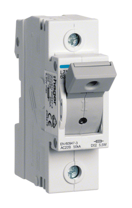 Lasttrennschalter mit Sicherungen D02 63A AC400 V 1polig Hutschiene. D0-Sicherungslasttrennschalter einpolig schaltbar für D02 Sicherungen, für Hutschienenmontage. Mit Meldesystem für Sicherungsausfall durch LED. Schraubkappenlose Stecktechnik bietet werksseitigen dauerhaften Kontaktdruck. Keine Kontaktlockerung während des Betriebes. Abschließbar mit Vorhängeschloss und plombierbar. Entnehmbarer Sicherungsstecker mit Fingerschutz. Entspricht der Gerätenorm IEC 60947-3.| Manufacturer / Brand | HAGER |