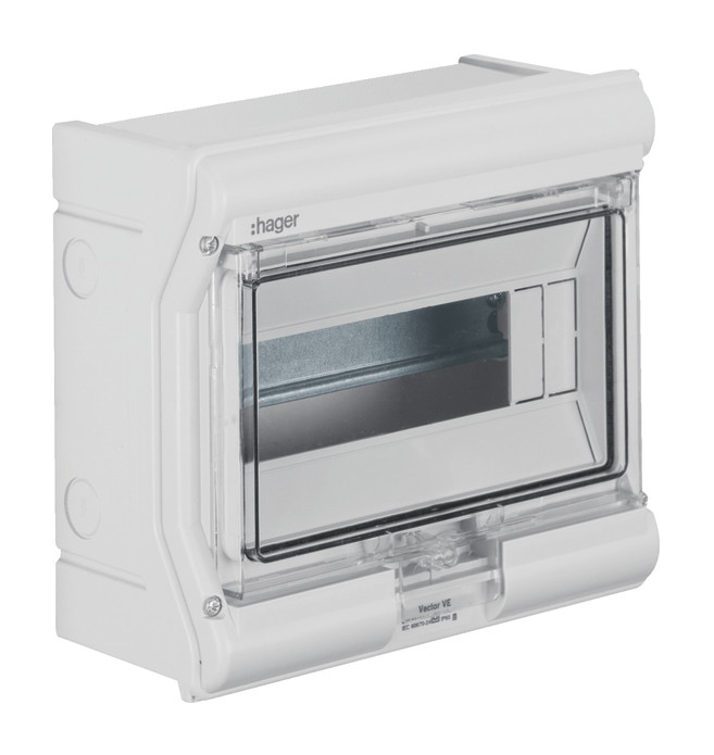 Kleinverteiler,vector,APV,IP65,10 Modul,UV-stabil,ohne Leitungseinführung. Installationskleinverteiler aus Polycarbonat (UV-beständig), nach DIN VDE 0603 Teil 1, nach DIN 43871. Zum Einbau von Geräten bis 63 A nach Maßnorm DIN 43 880 mit 70 mm oder 85 mm Einbautiefe, Bemessungsspannung AC 400 V/50 Hz. Bestehend aus Kunststoffunterteil mit Hutprofilschiene aus verzinktem Stahlblech, Vorprägung für metrische Leitungseinführungstüllen (oben, unten); seitliche Vorprägungen für Verbindungstüllen zur Verbindung von zwei oder mehreren Verteilern nebeneinander. Oberteil mit 46 mm Geräteschlitz. Klarsichttür frontbündig, rechts oder links anschlagbar, plombierbar, abschließbar, Verteiler anflanschbar.| Manufacturer / Brand | HAGER |