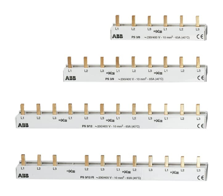 ABB Phasenschienen ermöglichen die sichere und wirtschaftliche Querverdrahtung von Sicherungsautomaten, Fehlerstrom-Schutzeinrichtungen und weiteren modularen Installationsgeräten. Für eine korrekte Phasenschienenauswahl muss Folgendes beachtet werden: Klemmentyp (Doppelklemme oder Käfigklemme), Polzahl der Geräte (1, 2, 3, 4, 1+N oder 3+N), Gerätetyp (Sicherungsautomaten, Fehlerstrom-Schutzeinrichtungen oder modulare Installationsgeräte), Kombinationen der verschiedenen Gerätetypen, Verwendung von Sicherungsautomaten mit rechts und unten angebauten Hilfsschaltern, Phasenschienen-Anschlussquerschnitt (Strombelastbarkeit), Anzahl der Module (Auswahl aus Standard-Phasenschienen oder kürzbaren Phasenschienen) ABB Phasenschienen ermöglichen die sichere und wirtschaftliche Querverdrahtung von Sicherungsautomaten, Fehlerstrom-Schutzeinrichtungen und weiteren modularen Installationsgeräten. Für eine korrekte Phasenschienenauswahl muss Folgendes beachtet werden: Klemmentyp (Doppelklemme oder Käfigklemme), Polzahl der Geräte (1, 2, 3, 4, 1+N oder 3+N), Gerätetyp (Sicherungsautomaten, Fehlerstrom-Schutzeinrichtungen oder modulare Installationsgeräte), Kombinationen der verschiedenen Gerätetypen, Verwendung von Sicherungsautomaten mit rechts und unten angebauten Hilfsschaltern, Phasenschienen-Anschlussquerschnitt (Strombelastbarkeit), Anzahl der Module (Auswahl aus Standard-Phasenschienen oder kürzbaren Phasenschienen)