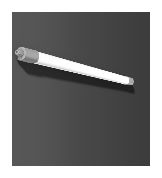 Ammoniakbeständige Feuchtraumleuchte. Seitenteile Kunststoff (PMMA) grau. Diffusor aus vergilbungsfreiem Kunststoff (PMMA) opal. Lichtverteilung symmetrisch. Homogene Ausleuchtung. Rückwärtiger Lichtanteil zur Deckenaufhellung. Flexible Installation durch verschiebbare Montagebügel. Ideal bei Leuchtenaustausch. Deckenmontagebügel aus Edelstahl und Triangel-Bügel für Pendelmontage im Lieferumfang enthalten. Betriebsgerät gekapselt, integriert und fest verbunden mit dem Diffusor und Seitenteil. Leuchte mit integrierter 4-poliger Durchgangsverdrahtung für das Aneinanderreihen von weiteren Leuchten. Komfortable Leitungseinführung über Kabelverschraubungen. MultiLumen-Funktion: Einstellbarkeit des Leuchtenlichtstroms in 2 Stufen. Werkseitig auf H (High - hoher Lichtstrom) voreingestellt. Leuchten mit begrenzter Oberflächentemperatur nach DIN EN 60598-2-24 zur Verwendung in einer Umgebung, in der eine Ablagerung von leitfähigem Staub auf der Leuchte erwartet werden kann. Ammoniakbeständig: Zur Verwendung in Ställen mit Nutztierhaltung und landwirtschaftlichen Nebenbereichen geeignet. Geeignet für den Einsatz in der Lebensmittel- und Getränkeindustrie.