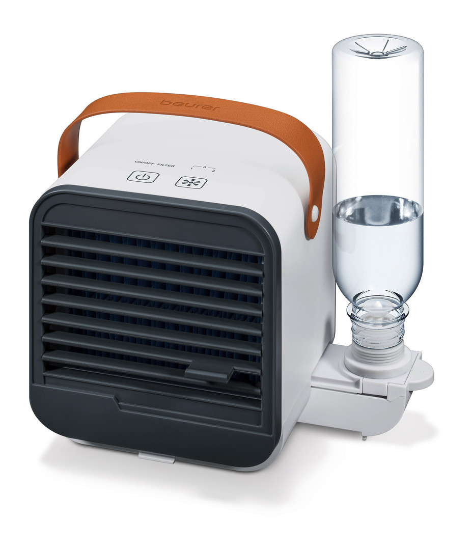 Luftkühlung und Luftbefeuchtung durch Ventilator und Verdunstungsprinzip kompakt und portabel, 3 Lüfterstufen, kühlt bis zu 4 Stunden (Betrieb auf höchster Stufe), Wasserflasche 0,25 l als abnehmbarer Wassertank, austauschbare Flasche und austauschbarer Verdunstungsfilter, auch ohne Wasserflasche als Ventilator nutzbar, Tragegriff, inkl. Micro-USB-Kabel, Input: 5 V DC, 0,5 A, 3 Jahre Garantie
